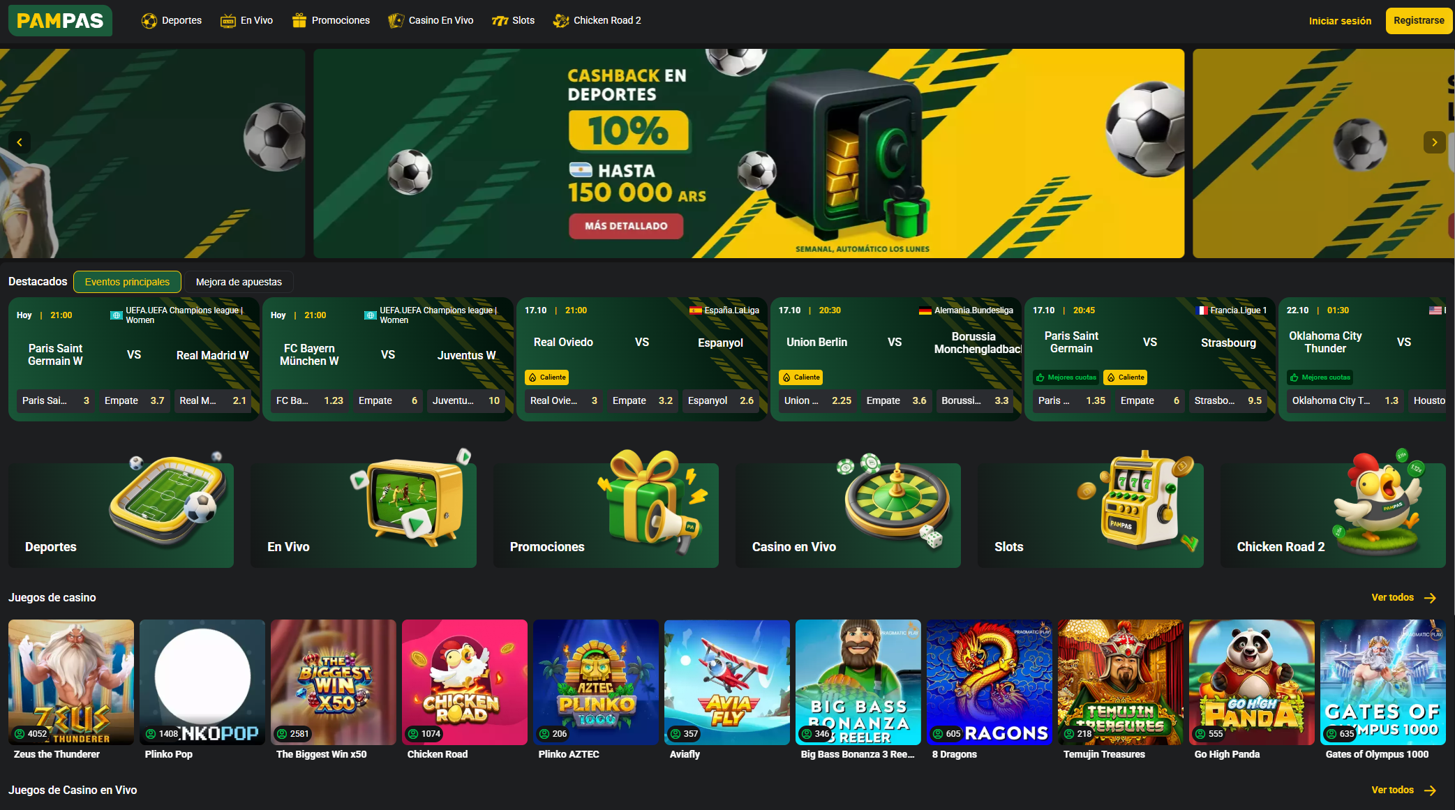 Pampas te ofrece casino online y apuestas deportivas desde 2023, con slots, ruleta, blackjack, juego en vivo y más. Tenés más de 10 métodos locales para tu cuenta, entre ellos Transferencia bancaria y Mercado Pago. La operación se ampara en licencia internacional y cifrado SSL. Usá la versión móvil PWA y activá tu bono de deporte hasta 400% hasta ARS 770.000 en 5 primeros depósitos o casino hasta 400% hasta ARS 2.000.000 en 5 depósitos.